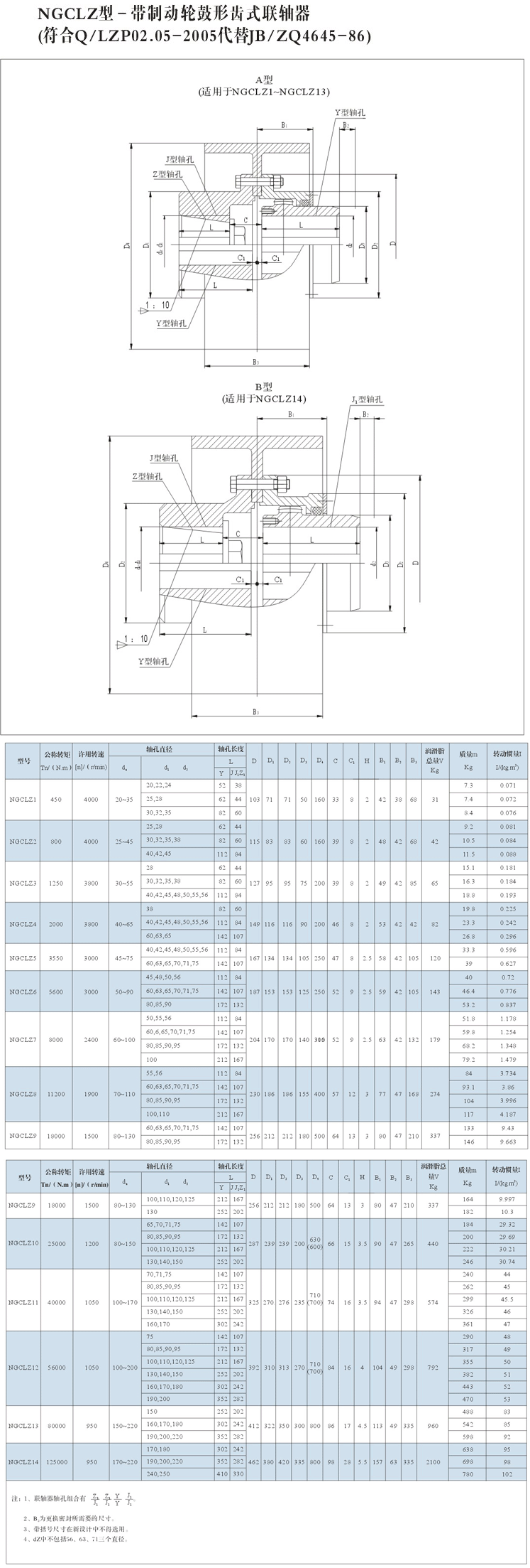 NGCLZ12帶制動輪鼓形齒式聯軸器的結構是由兩具有相同齒數的外齒軸套和兩帶有凸緣的內齒圈零件組成。兩外齒軸套分別用鍵銜接固定在被鏈接兩軸的軸端,兩內齒圈的內齒與軸套上的外齒相嚙合,其凸緣用螺栓鏈接,從而完成兩軸的鏈接,外齒軸套及內齒圈上的齒輪為嚙合角a=20°的漸開線齒。NGCLZ型齒式聯軸器為帶制動輪式鼓形齒式聯軸器,詳細規(guī)格見下表。